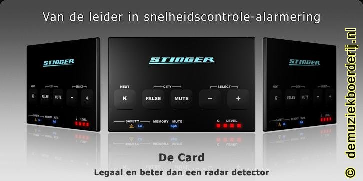 Het nieuwe product van Stinger, naast de bekende Stinger DSI is er nu de Stinger DE CARD, Stingers onge-evenaarde techniek.Met onder meer laser alarmering het legendarische lasershield (optie) radar alarmering,traject controle,spotlist alarmering en safety signals.